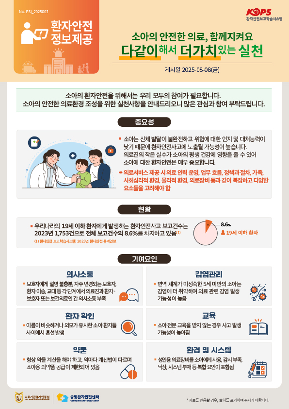 - 세계 환자안전의 날 주제인 ‘소아를 위한 안전한 의료’에 맞추어 보건의료인을 위한 정보제공지와 일반 국민을 위한 정보소식지 배포