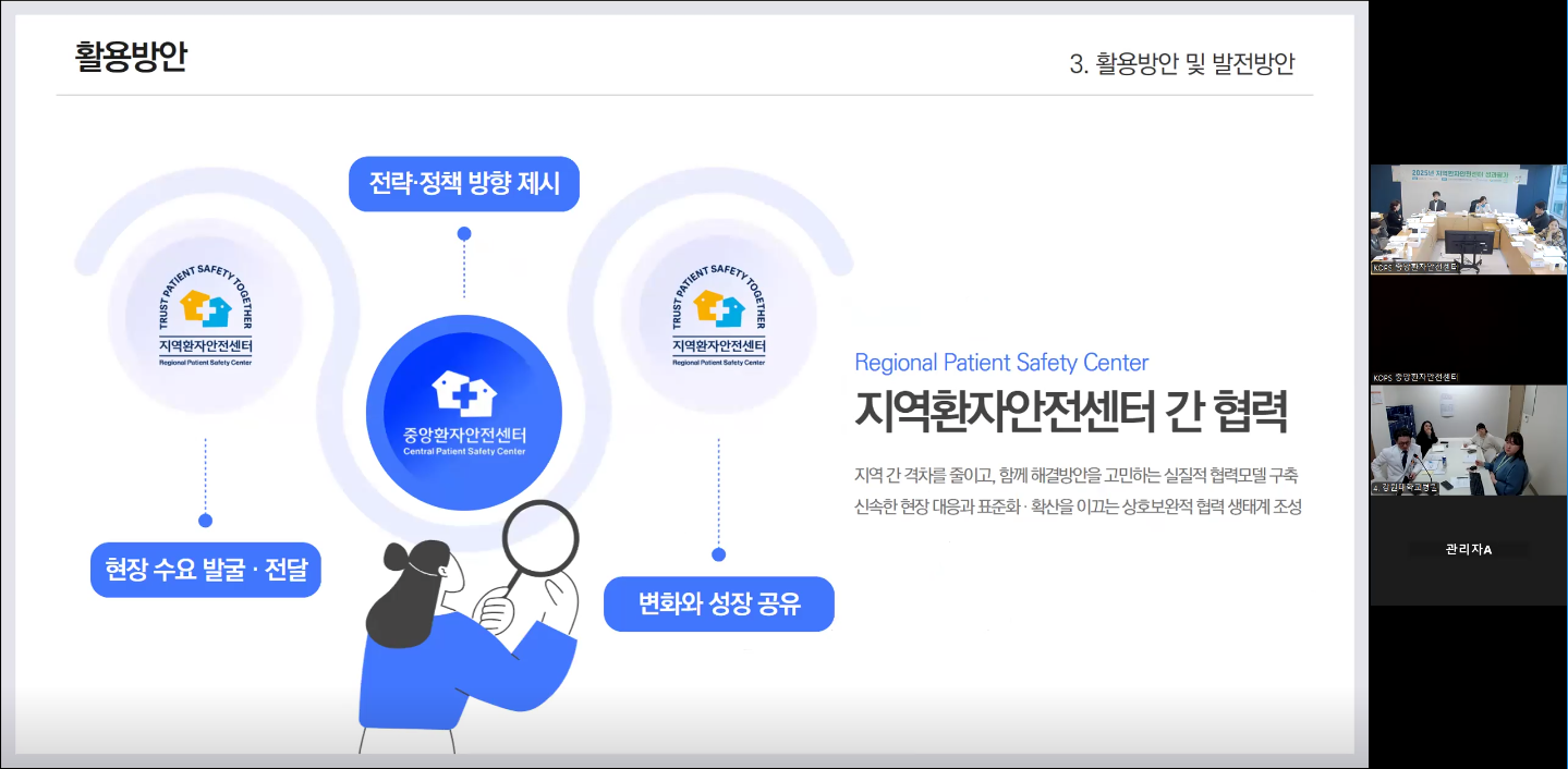 - 보건복지부, 대한환자안전질향상간호사회, 시·도별 환자안전 전담인력들과 함께 의료기관의 환자안전활동 공유 및 지원 방안 논의를 통한 제도 개선 방안 도출